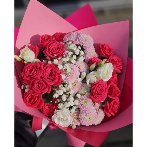 The bouquet consists of 2 lisantus, 5 spray roses, 3 santini chrisantemum and gipsofila.