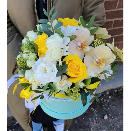 Composition with 5 roses, 1 orchid, 3 ranunculus, 2 eustoma, 5 diantus, 2 skimmia and greens.