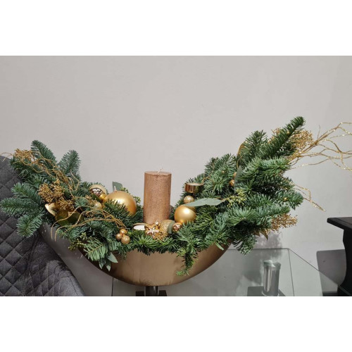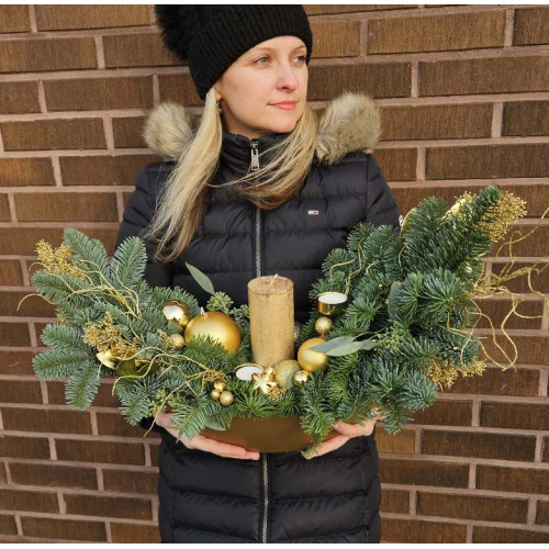 Adventes kompozīcija no dzīvas Nobilis egles ar 4 svecēm, skimiju, eikaliptu, dekoaratīviem materiāliem plastikas podā (55x35cm).