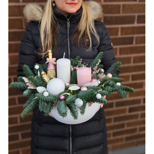 Adventes kompozīcija rozā toņos podā no dzīvas Nobilis egles ar 4 svecēm keramiskā podā, izmērs 35x30cm.