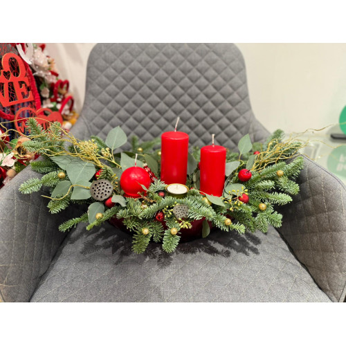 Adventes kompozīcija no dzīvas Nobilis egles ar 4 svecēm, eikaliptu, dekoaratīviem materiāliem plastikas podā (50x22cm).