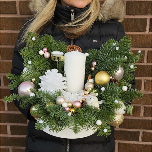 Adventes kompozīcija ar putniņu no dzīvas Nobilis egles ar 4 svecēm keramiskā podā, izmērs 35x30cm.