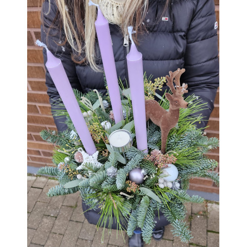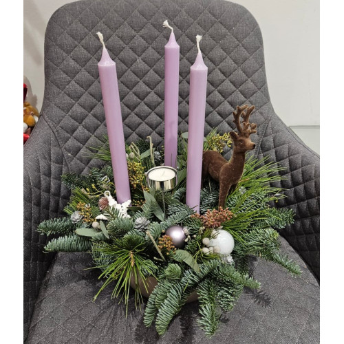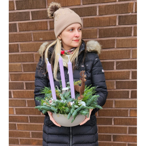 Adventes kompozīcija ar briedi keramiskā podā no dzīvas Nobilis egles ar 4 svecēm keramiskā podā, izmērs 35x30cm.