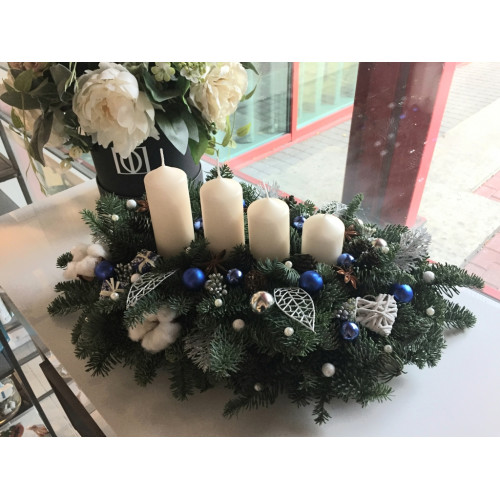 Adventes kompozīcija zilos toņos no dzīvas Nobilis egles ar 4 svecēm, garums 40 cm