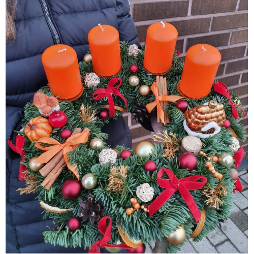 Adventes vainags ar namiņu no dzīvas Nobilis egles ar 4 svecēm, diametrs 35 cm