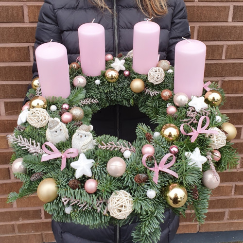 Adventes vainags rozā toņos ar baltām svecēm un putniem no dzīvas Nobilis egles ar 4 svecēm, diametrs 45 cm