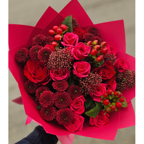Pušķis, kas sastāvā ir 3 rozes, 3 krūmrozes, 3 hipericum odziņas, 3 santini hrizantēmas un 2 skimijas.