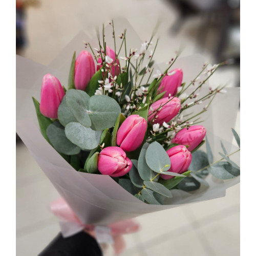 Pušķis, kas sastāvā ir tulpes un smaržīgie genistra ziedi un eikalipts.