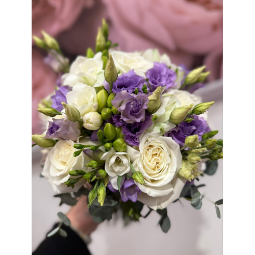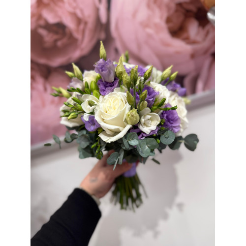Букет невесты из белых роз, лилового лизантуса, фрезий и эвкалипта.