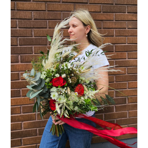 Букет невесты с розами, полевыми цветами, пампой, сухоцветами, рускусом и эвкалиптом.