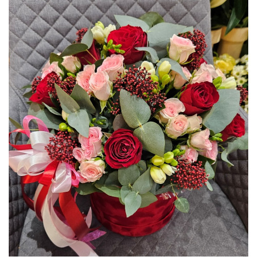 Композиция из 11 красных роз, 10 фрезий, 16 кустовых роз, скимии и эвкалипта.