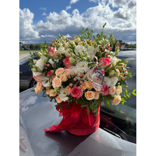 Композиция из 19 роз, 20 кустовых роз, 20 эустом, 15 ягод гиперикума и зелени.