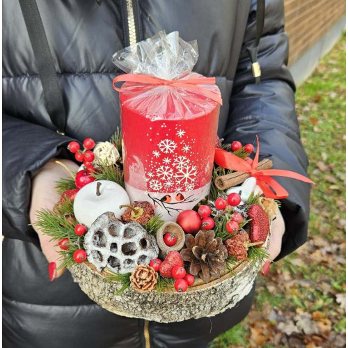 Рождественская композиция на деревянном спиле из искусственных материалов и шишек с одной свечой, размером 15х16см.
